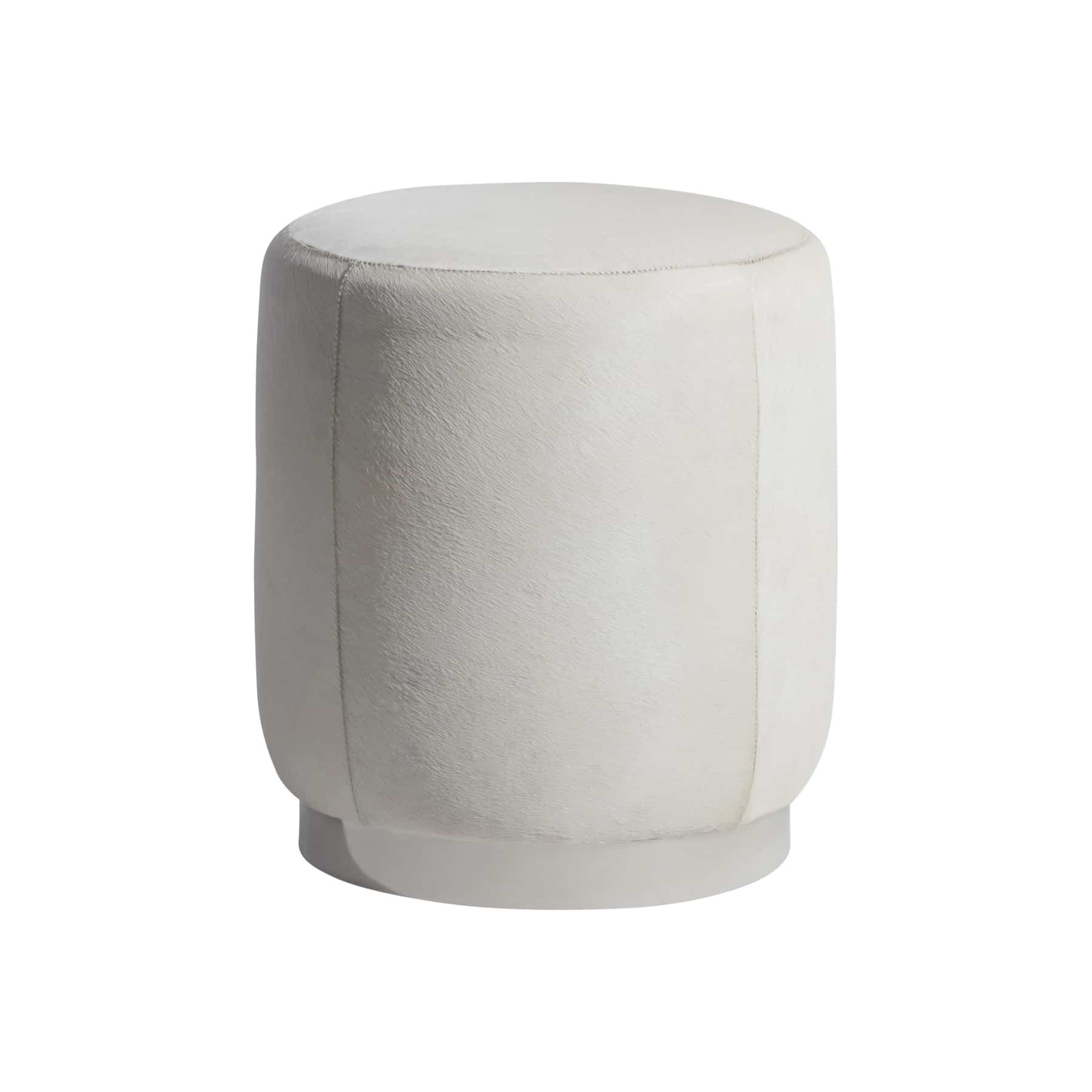 The Ash ottoman has a more modern profile, highlighted by stitched panels of hair-on-hide and a round, raised top. The fully upholstered seat rests on a stainless steel base.
