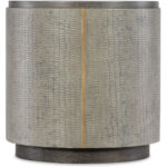 With the design flair of a luxurious fashion accessory, the Dylian End Table has a gray crocodile exterior with gold metal accents and a dark wood Top and base. Crafted of Pine Veneers and Robus Leather, it is 24 inches round.